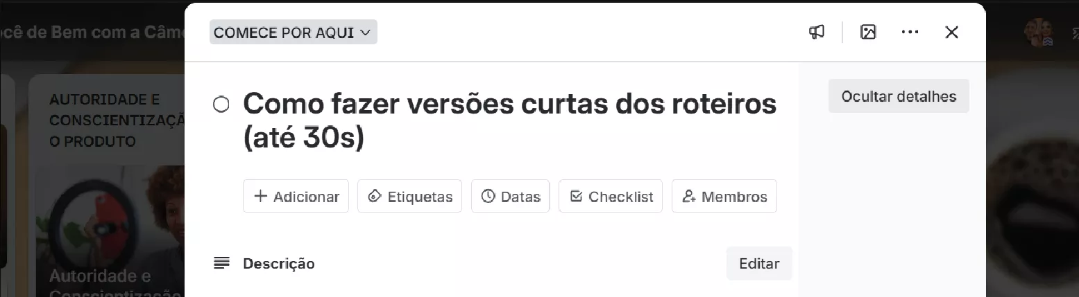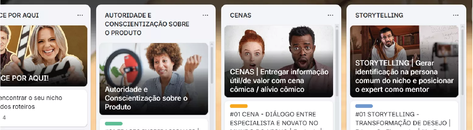 1. Escolha um roteiro dentro das 3 categorias na plataforma do Trello: Autoridade, Cenas ou Storytelling