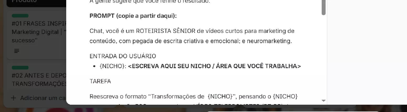 - Cada card do Trello trás 1 roteiro e 1 prompt inteligente, que permite adaptar cada roteiro para o seu nicho, com poucos cliques. Os prompts foram elaborados com alta qualidade de engenharia de prompt, incluindo estratégias como otimização para S.E.O. (garantindo o alcance das pessoas certas).